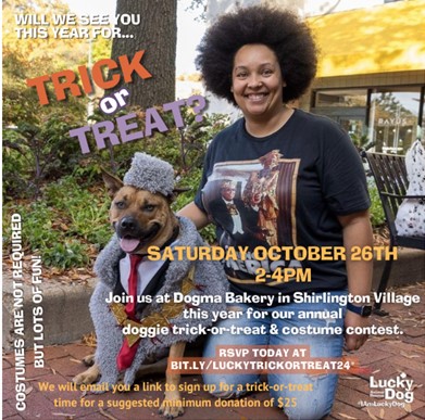 | | |  | Sign Up for Doggie Trick-or-Treating at Dogma Bakery! Join us on Saturday, October 26th from 2-4 PM at Dogma Bakery in Shirlington Village for a paws-itively fun event to show off your pup’s (and your own) costumes! We can't wait to see them! Not dressing up? Come by to mingle with two-and four-legged friends and enjoy free treats! Spots are going fast! If you love this event as much as we do, donate today to secure your time slot. Confirmation emails will include signup details and all proceeds will help Lucky Animals in need. |