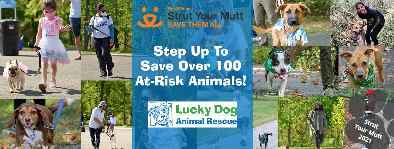 Strut Your Mutt is Back! Join Lucky Dog's 2021 SYM Team & Save Lives It's that time of year again: Time to Strut Our Mutts! Every year for the past seven years, our amazing Lucky Dog Family has joined together and raised thousands of life-saving dollars, walking with friends, family, and, of course our pets! It's so easy to join the team. Simply click the button below. Select "join the Lucky Dog Animal Rescue Team" when prompted, and create your personalized page. Share your page with family, friends, and everyone else you know, and tell them why YOU want to save lives. We'll even give you suggested text and photos that you can use each week -- or create your own! All that matters is we are saving lives together! Then, on October 30th everyone who has raised over $100 gets a FREE entry to Trick-or-Treating with Dogma Bakery where you can trick or treat with your pup around Shirlington Village. Our goal this year -- raise the funds needed to save over 100 at-risk dogs and cats. Added bonus: you can track your walks as you go with the ResQwalk app. Share your walking and lifesaving successes on social media directly from the app and enter to win the opportunity to have a picture with you and your pet(s) featured by Best Friends Society's social media -- ALL while saving homeless animals! |